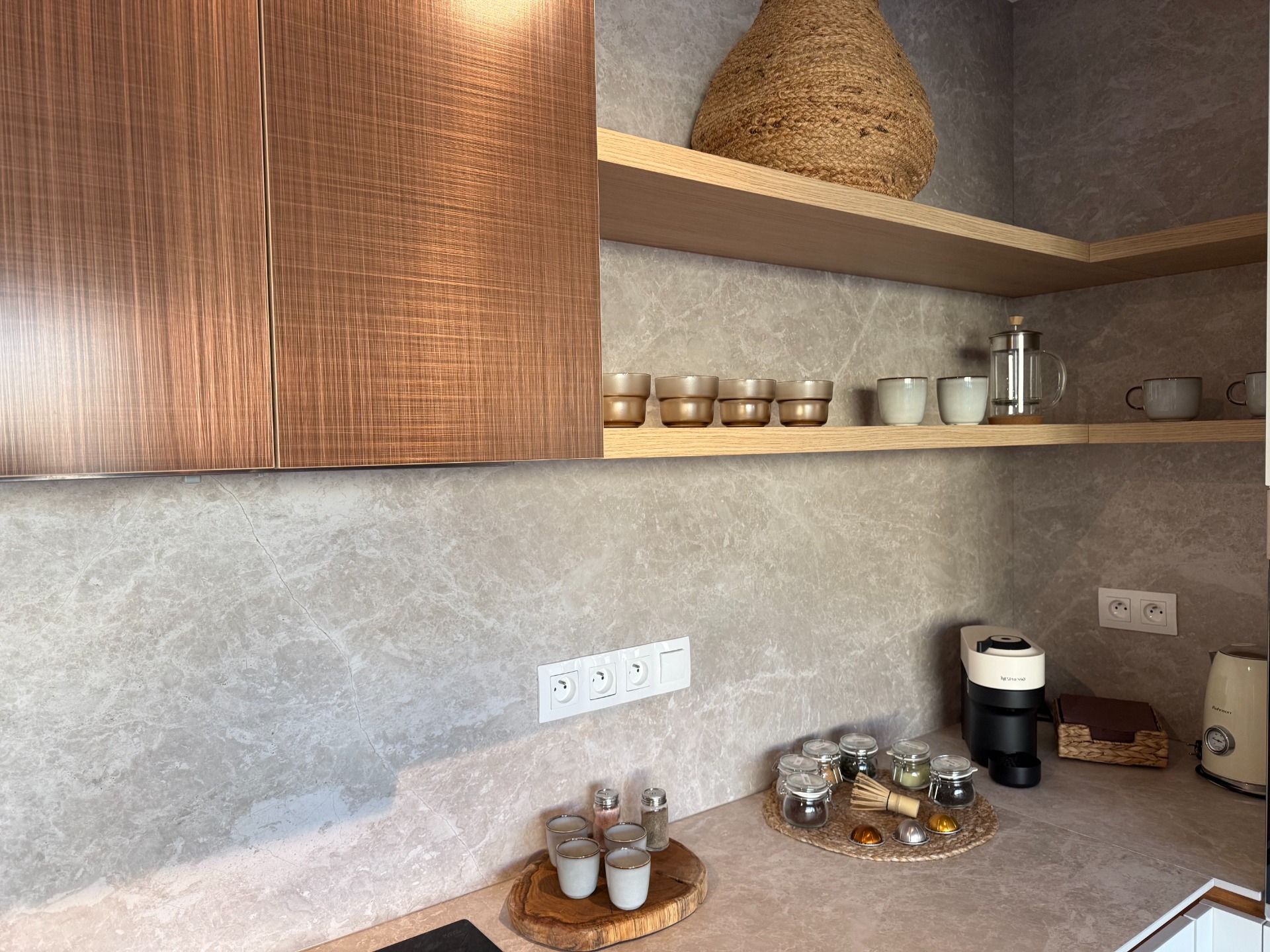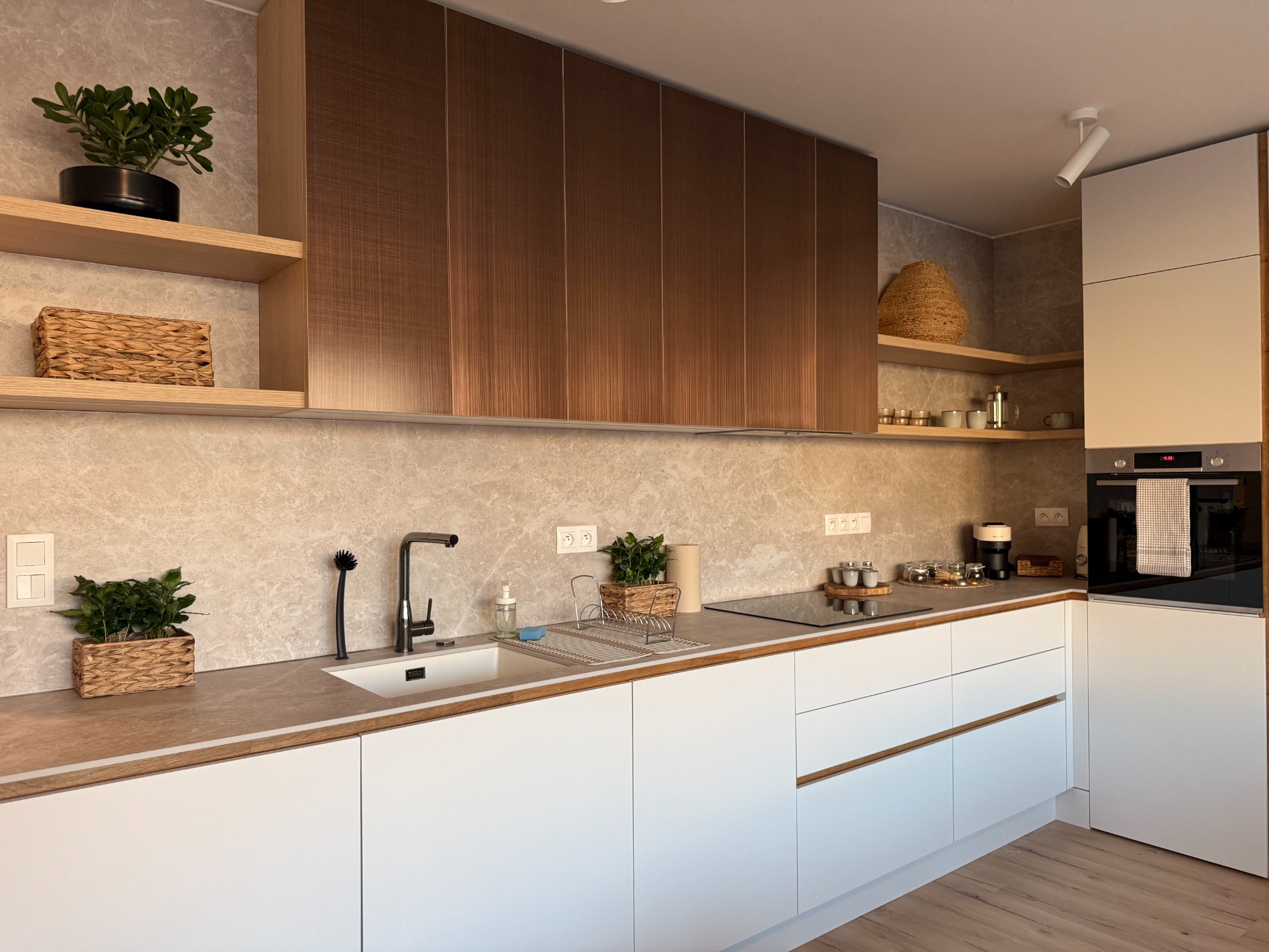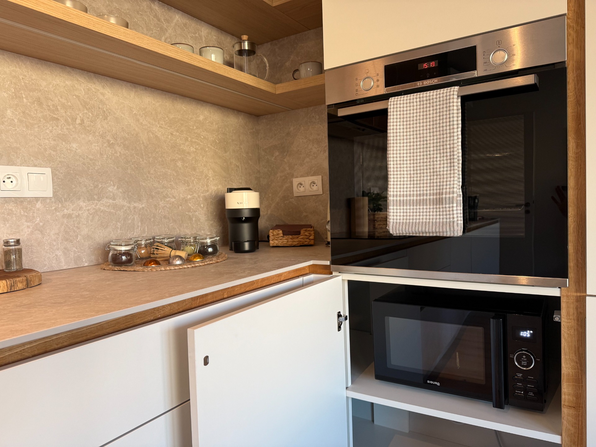 Kuchyňská linka je plně vybavená — myčka, trouba, mikrovlnka, varná konvice, kávovar Nespresso i ruční mixér.
